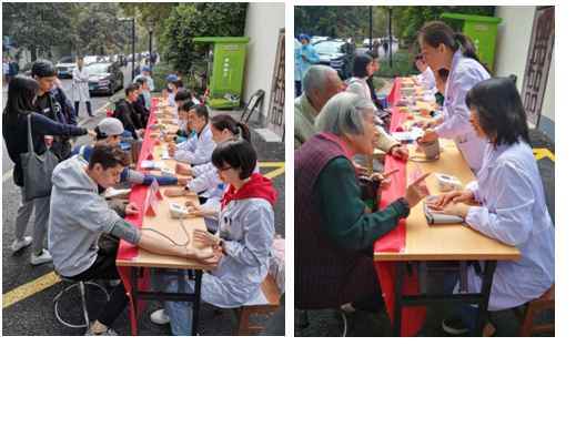 在活动现场,为退休老师和在校学生进行血压测量并就测量结果提出一些建议和意见,耐心解答接受师生提出的健康咨询问题,并给出具体的诊疗建议和饮食、用药、保健指导。